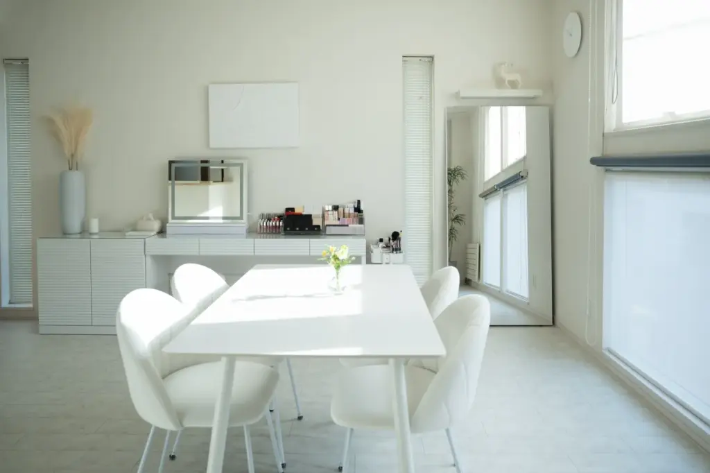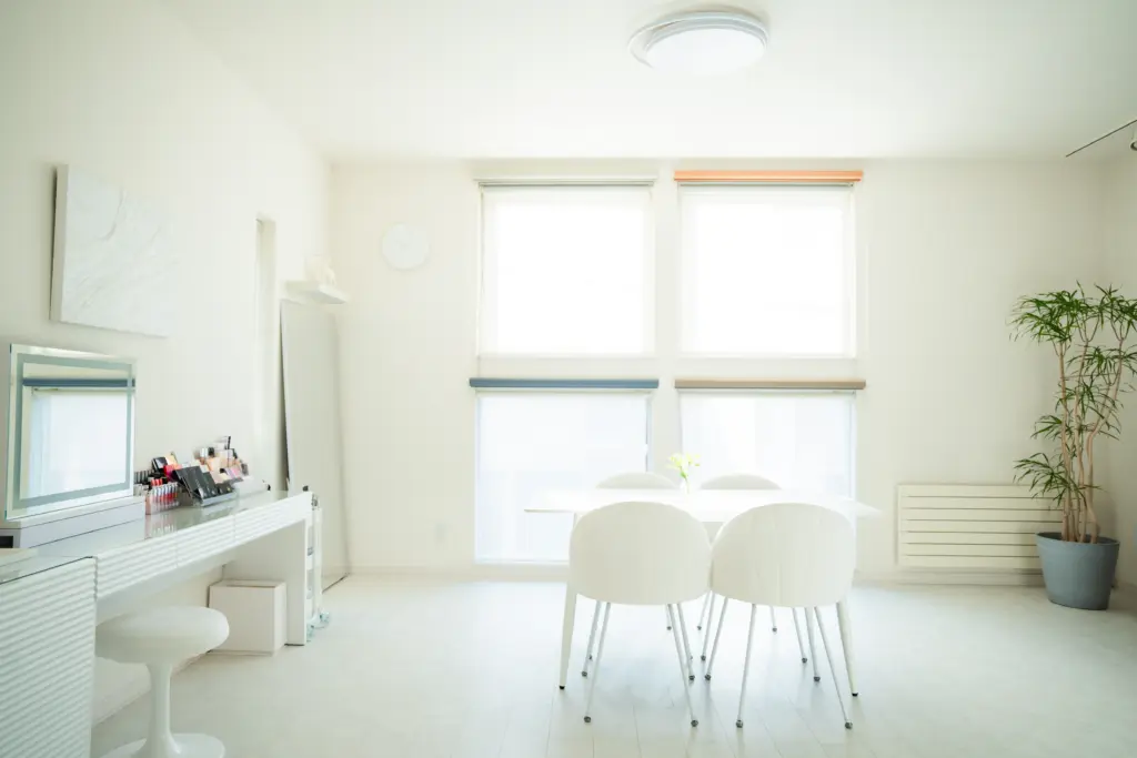 SERENITE(セレニテ)は、自宅のリビングを改装したプライベートサロンです。ゆったりとした空間に、白を基調としたシンプルモダンなインテリア。高めの天井が生む開放感と、柔らかな自然光に包まれながら、落ち着いた雰囲気の中で、診断やメイクをお楽しみいただけます。